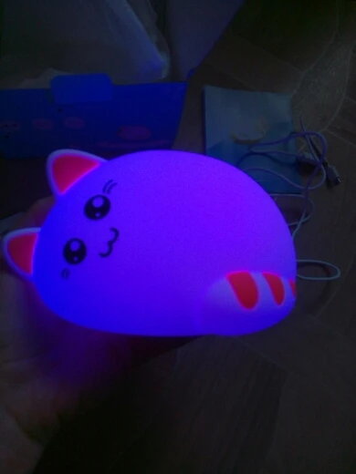 Cool night light, i order the second of this type. First took cheaper without a remote for the younger daughter as a night lamp. We exploit in children's two months. Became a favorite toy. The youngest daughter (she is six months old) plays with him, gnaws. Nothing will happen to him, even if you drop it. The eldest asked her to buy this only with a remote control. The light is soft, pleasant to the touch very pleasant velvety silicone. Multiple modes: warm white light, red, green, blue, etc. And flashing mode and automatic light change. Turns on the button on the belly of the cat, the same and the charging hole (the cord is included, but suitable from any phone). The charge lasts for a couple of nights, then the light gradually becomes paler. From the console (the battery is inserted), plus cotton on the surface switch modes. Shipping month, track tracked. Packed in a branded box, complete with a charging cord and english manual with pictures. Very satisfied with the night lamp! Definitely worth your money.
